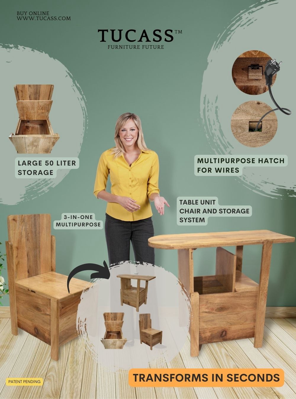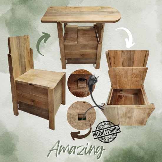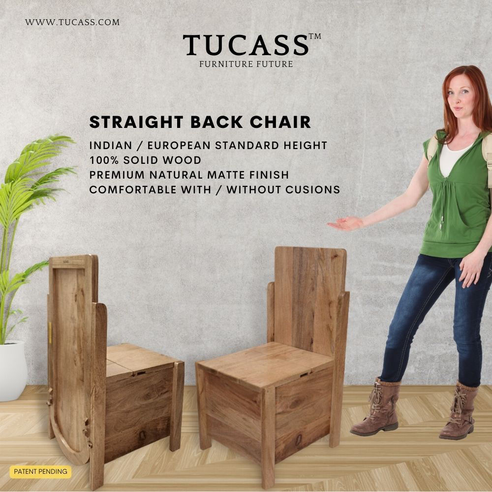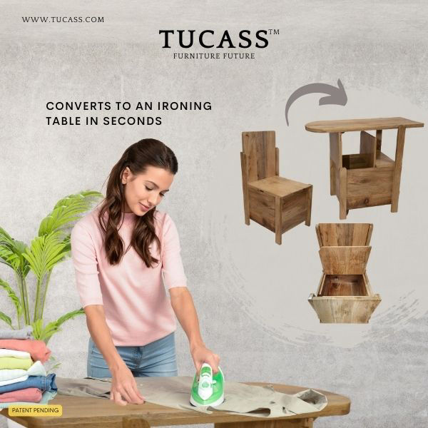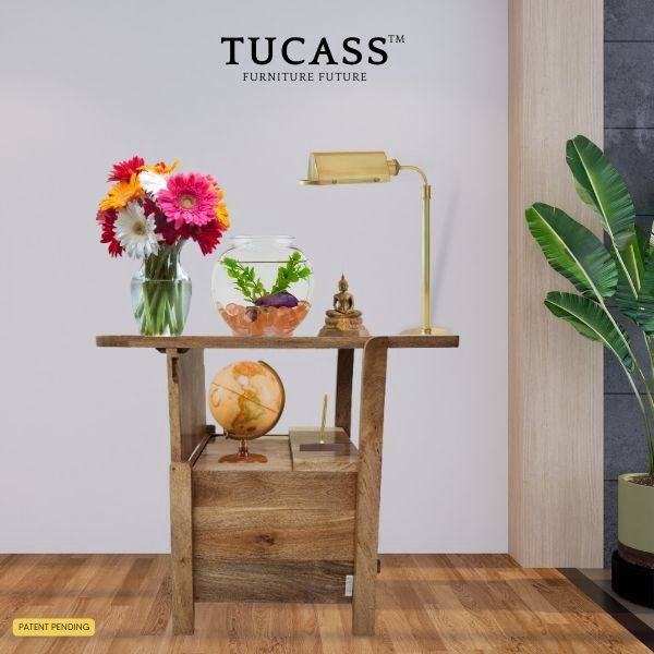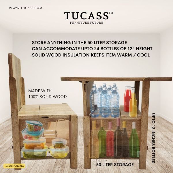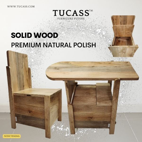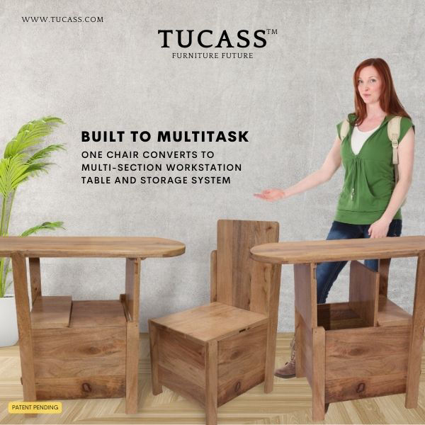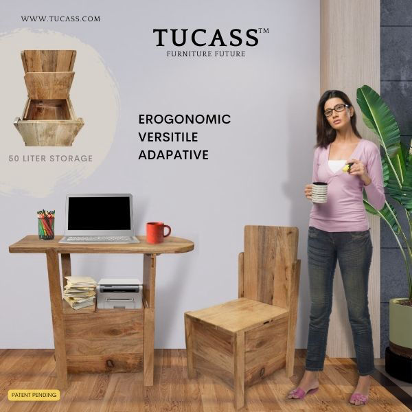 TUCASS (Patented Product) is a versatile single piece multipurpose convertible furniture made of solid wood for your Home and Office that adapts to your requirement of a Chair or a Table workstation with a large 50 liter storage and can be used without any assembly.